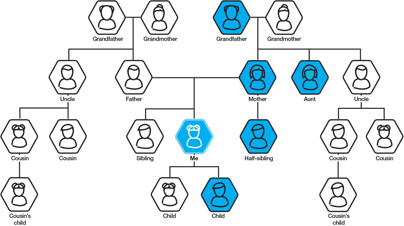 The people highlighted in blue could have the Fabry mutation, but in reality, it is unlikely that they all will. As Fabry is rare and you only need one Fabry mutation to experience the disease, it is likely that only one side of your family will be affected, for example.
